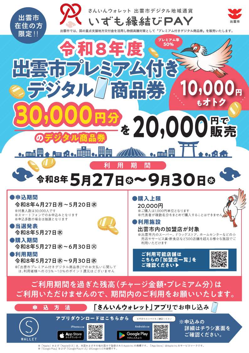 出雲市では、いずも縁結びPAYが使える「さんいんウォレット」アプリを活用した、プレミアム率50%(前回令和7年度:30%)のデジタル商品券の抽選販売を行います。デジタル商品券を購入するためには、事前申し込みが必要です。事前申し込みで当選された方(対象人数:30,000人)は、最大20,000円で30,000円分の商品券が購入できます。