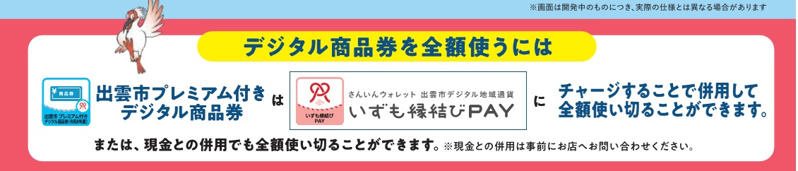 デジタル商品券(利用期限あり)の残高が僅かに残った場合は、いずも縁結びPAY(利用期限なし)のおサイフにチャージし、併用してお支払いいただくと、全額使い切ることができます。