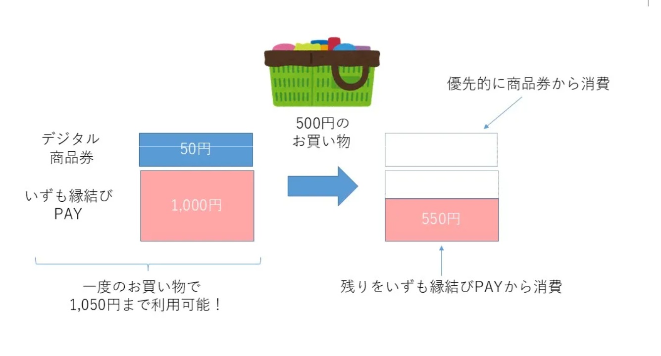500円のお買い物をすると・・・残高1,050円からデジタル商品券の50円が先に消費され、いずも縁結びPAYから残り450円が消費されます。