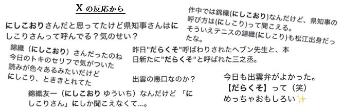 また、「にしこおり」の読み方に新鮮さを感じるドラマ視聴者の方もいらっしゃったようです。地域によって、「にしきおり」「にしこり」「にしごおり」~他、様々な読みがあります。島根県内でも複数の読み方がありますが、出雲エリア、荘原地内では「にしこおり」読みが多いです。