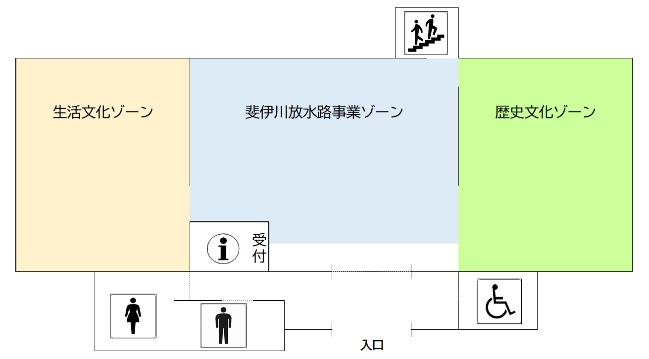 斐伊川放水路事業記念館では、島根県百年の大計といわれる斐伊川・神戸川治水事業の一つである斐伊川放水路事業を中心に、計画策定から完成までのあゆみや、事業に伴い調査された埋蔵文化財、斐伊川放水路事業により生活環境が大きく変わった沿川地域の記録などを、「放水路事業ゾーン」、「歴史文化ゾーン」、「生活文化ゾーン」に分けて展示、説明しています。