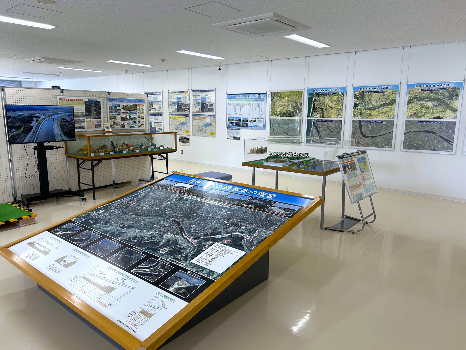 放水路周辺の模型や航空者写真のほか、建設機械の模型や化石なども展示しています。