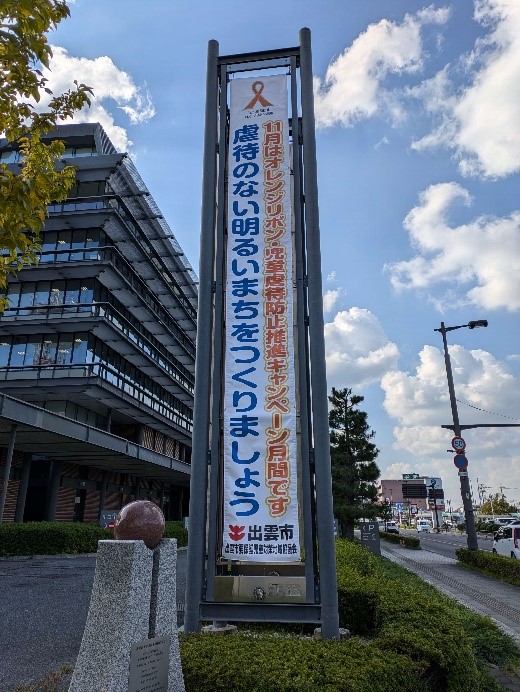 児童虐待予防やこどもや家庭を社会全体で支える大切さについて啓発を図るため、出雲市要保護児童対策地域協議会※の機関・団体関係者が、児童虐待防止のグッズ、チラシ等を配布します。