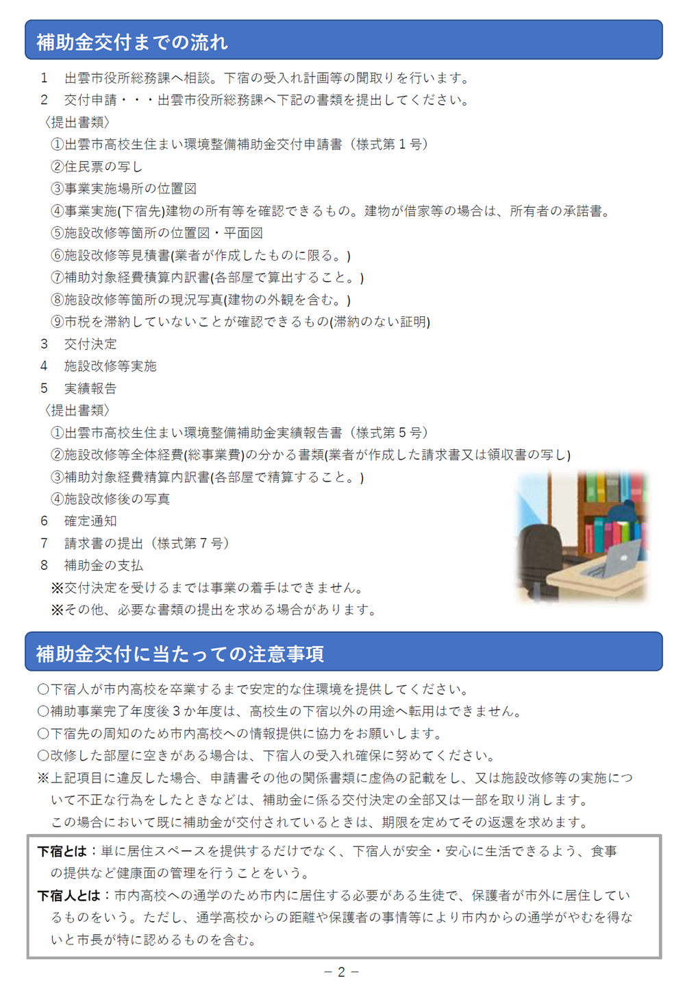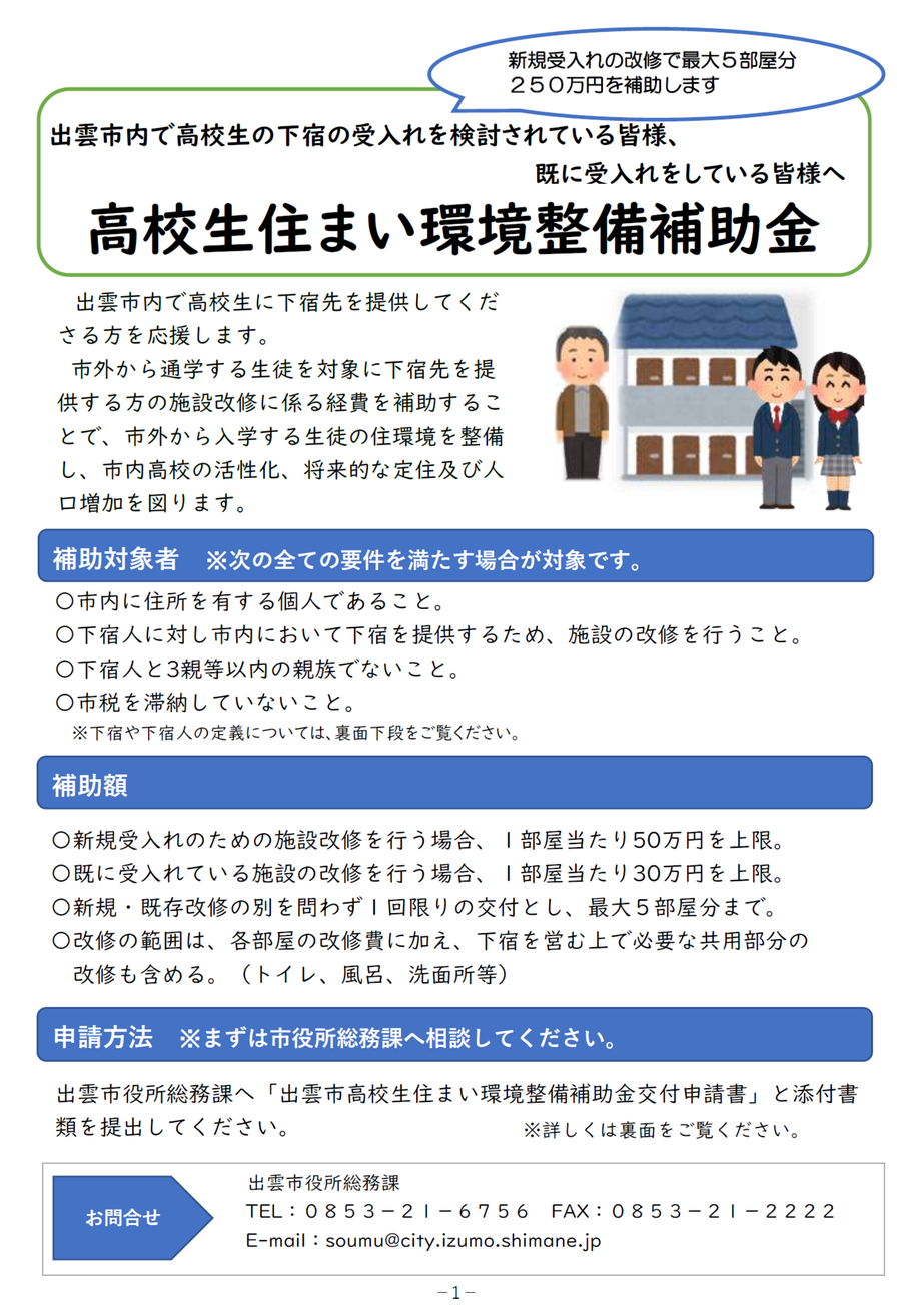 出雲市内で高校生の下宿受入れを検討されている皆様へ「高校生住まい環境整備補助金」を交付します