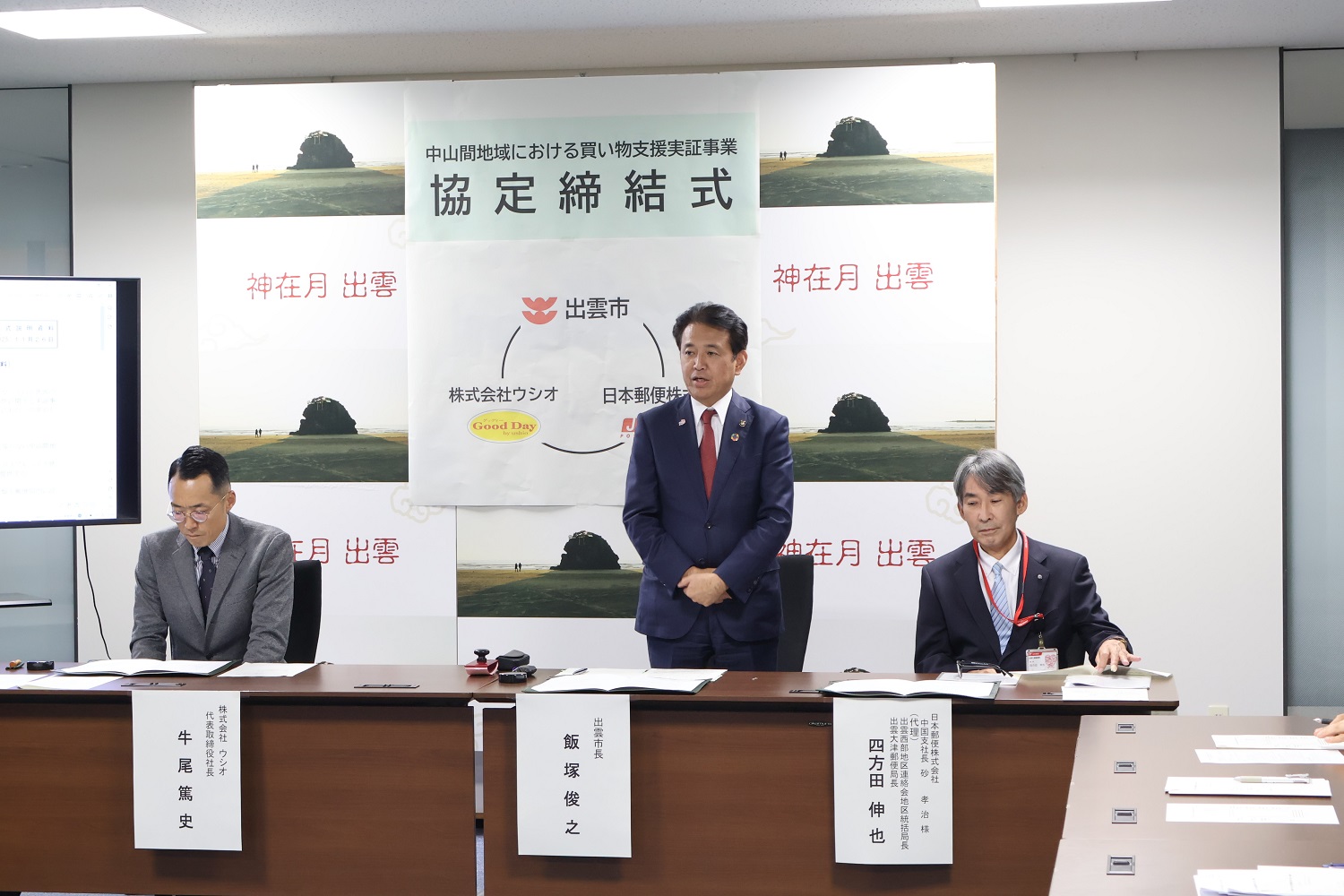 令和7年11月26日、スーパー「グッディー」を運営する(株)ウシオ様、日本郵便(株)中国支社様と、中山間地域の買い物支援に向けた協定を締結しました。