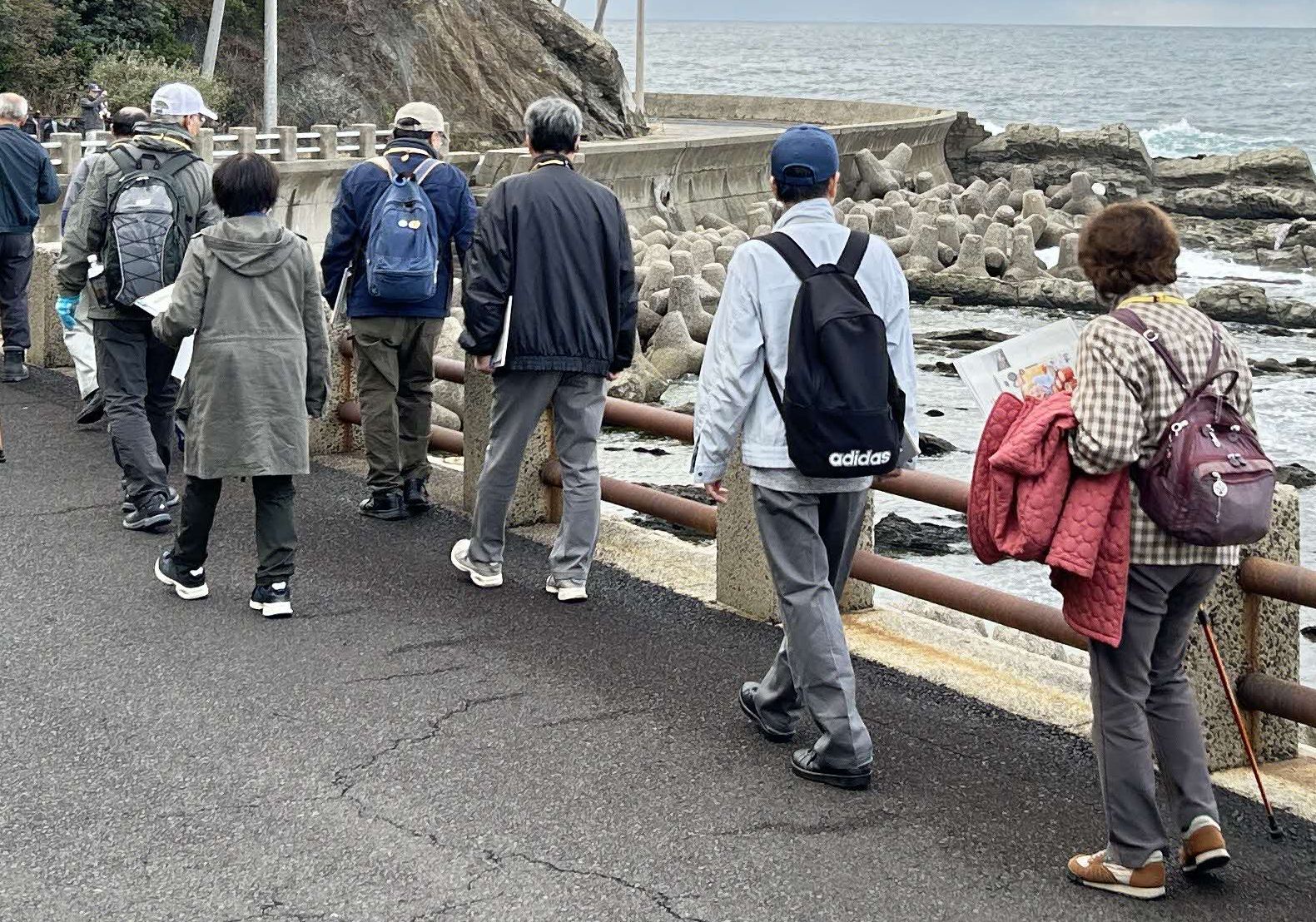 また、洗濯岩の見学では、水の流れや土石流が作り出した地層であること、長い時間をかけてこのような岩ができあがったとのことだった。地域の人が、この岩で11月ごろからのり摘みを行うこと、名物のアマダイは地域でもよく食べられていることやブランド魚になっていることなど、「くらし」にまつわることを詳しくお説明していただき、その日は少し波が高かったことから、日本海ならではの海の様子も参加者の皆さまに見学していただけました。