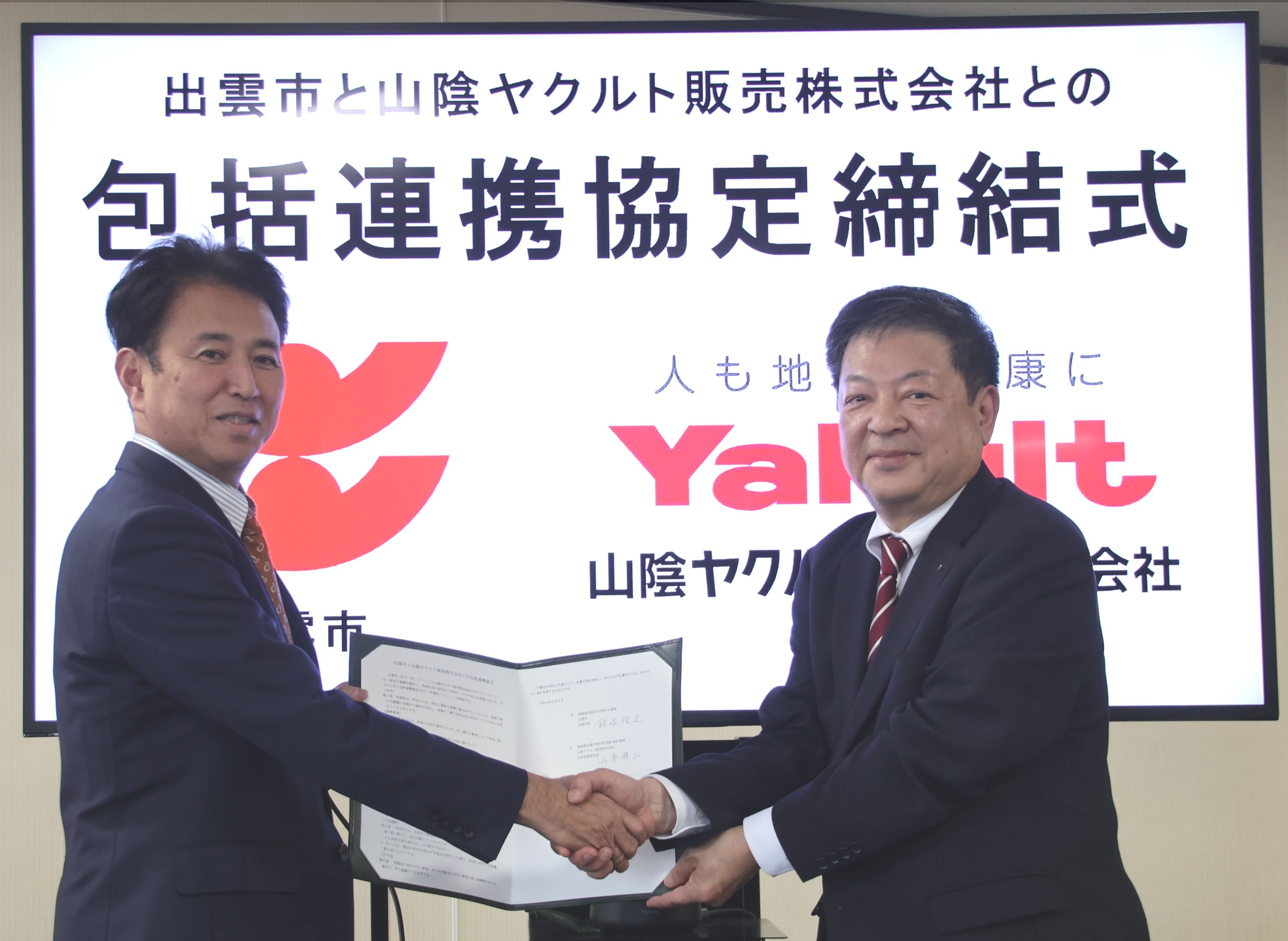 出雲市と山陰ヤクルト販売株式会社は、令和8年2月6日、「出雲市と山陰ヤクルト販売株式会社との包括連携協定」を締結しました。この協定は、高齢者や障がい者・子どもなどの地域見守り支援、災害対策・防犯や市民の健康づくり推進等の分野において相互に緊密な連携と協力をすることにより、地域の様々な課題に迅速かつ適切に対応し、地域の一層の活性化及び市民サービスの向上を図ることを目的としています。