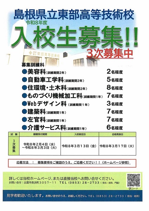島根県立東部高等技術校では、令和8年度入校生の3次募集を行っています。