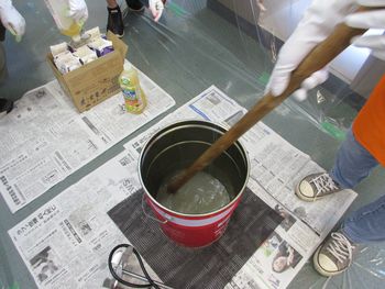参加者・スタッフ合わせ13名が参加して「廃食油石けん作り」を行いました。 |