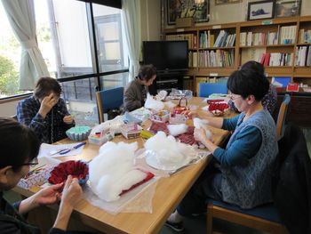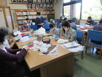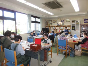 講師に高野松子さんをお招きし、17名が参加してカボチャ型の小物入れを作りました。 |