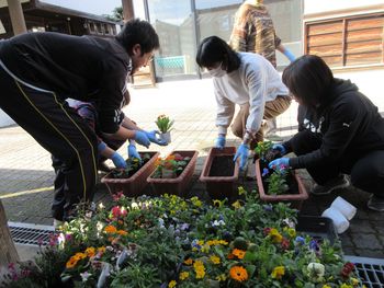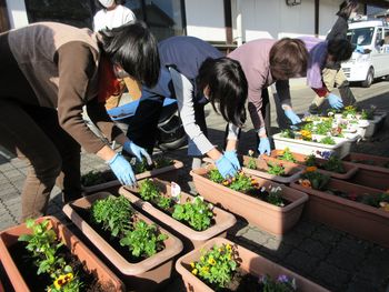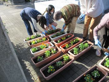 秋晴れの日に、参加者12名で花植え作業を行いました。 コミセンの玄関周辺がパンジーやビオラ等々で華やかになりました。 |