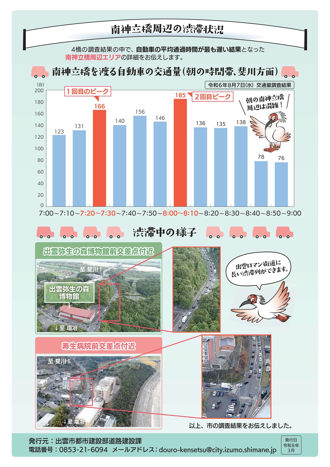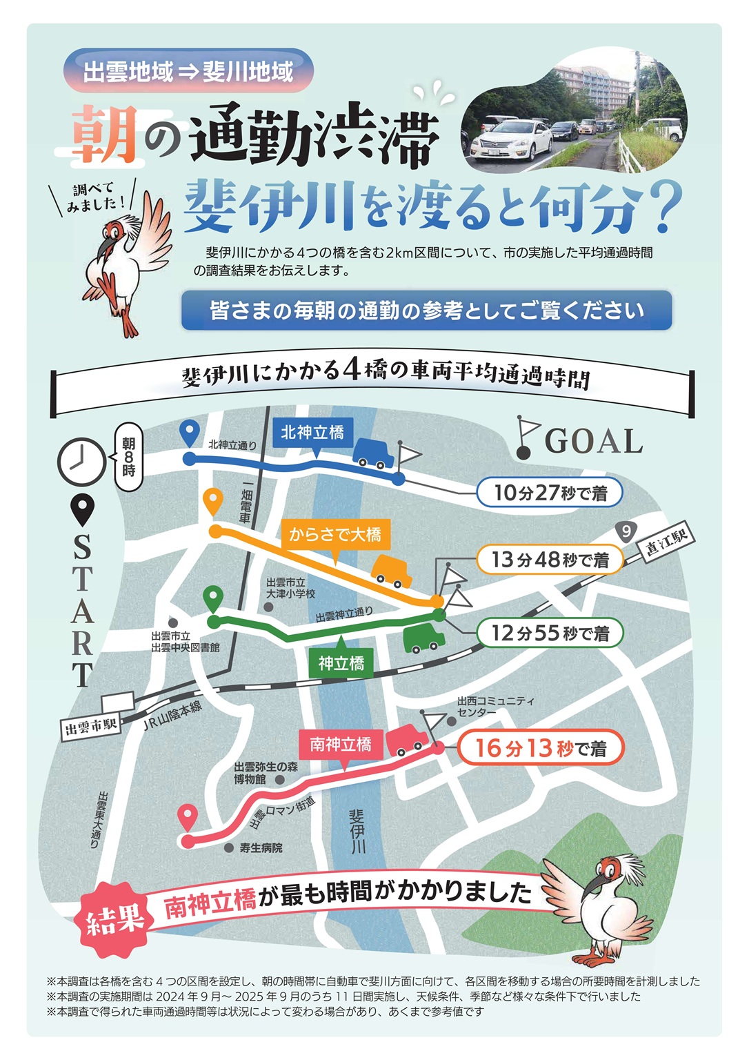 出雲市では、朝の通勤時間帯において、旧出雲市内から斐川方面への慢性的な交通渋滞が問題となっており、特に南神立橋周辺では顕著となっていました。このことから、令和6年度より南神立橋周辺における空撮調査、交通量調査、及び斐伊川にかかる4橋(北神立橋、からさで大橋、神立橋、南神立橋)の通過時間調査を実施しました。調査結果を取りまとめたものについて掲載しますので、毎朝の通勤の参考として下さい。